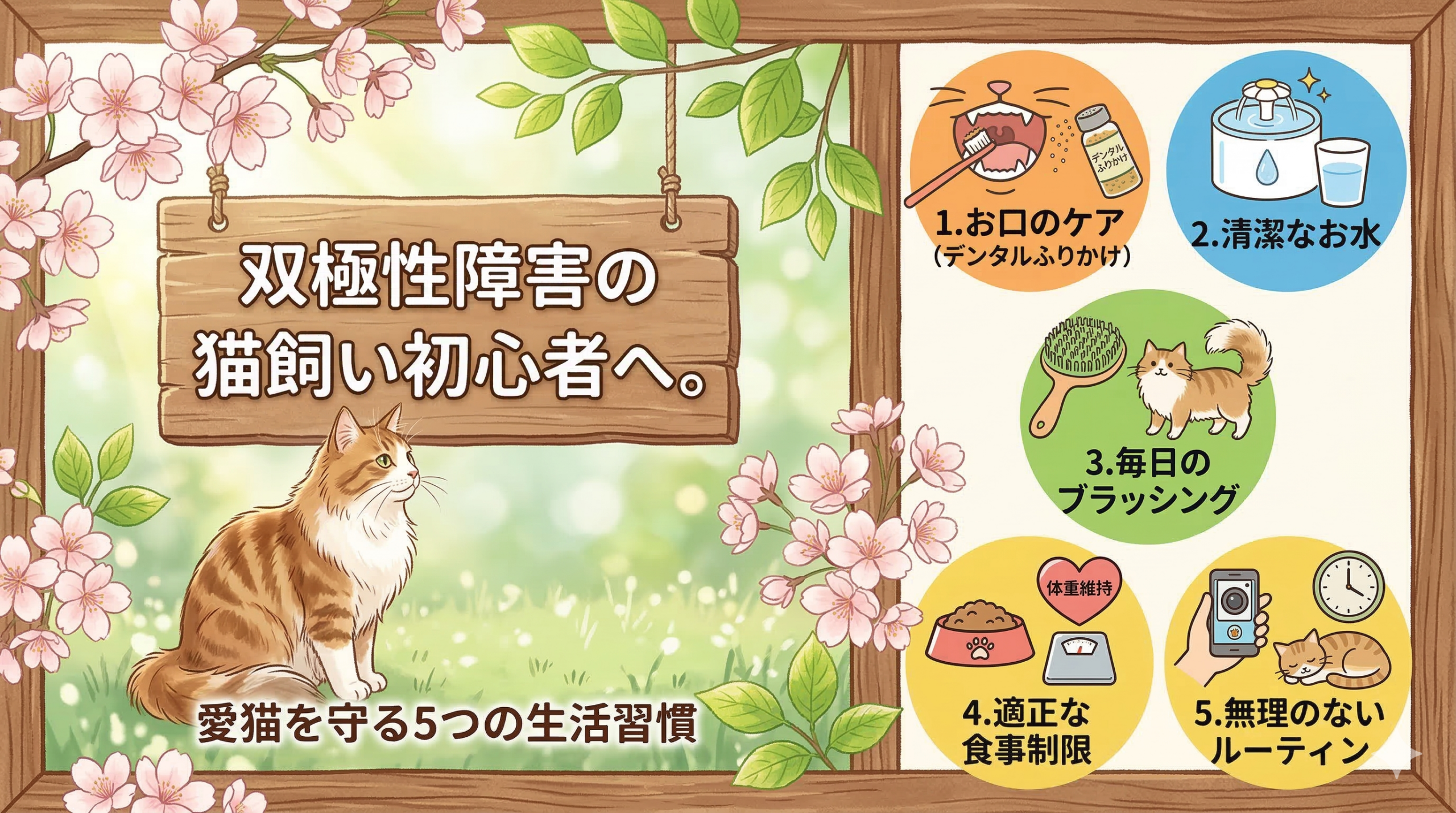 これだけは押さえておきたい5つの習慣。双極症であっても自分ではなく猫様のためなら、と立ち上がれるのではないでしょうか?ブラッシングが一番めんどくさいとか思ってしまいますが、猫様のためです。その日一日の気力体力全部使ってでもやり遂げましょう。