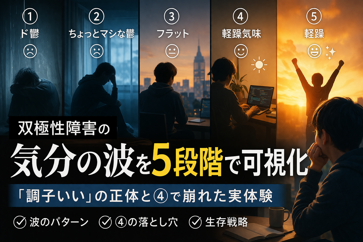 - ④:軽躁気味(少し楽しい、動ける、調子がいい気がする)