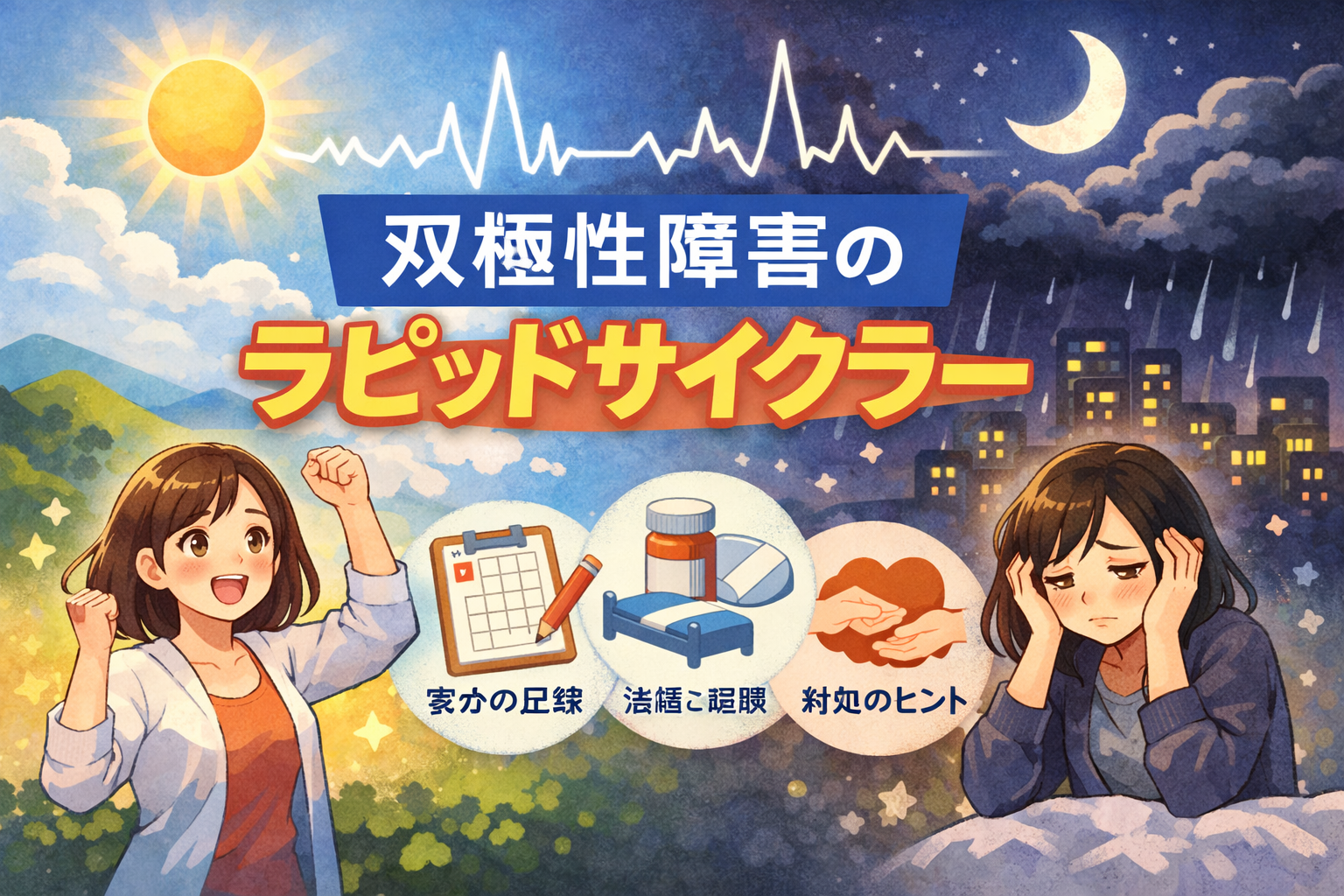 ここは原因を一つに決めつけないほうがいいです。双極性障害そのものがそうですが、睡眠、生活リズム、ストレス、体調の変化など、いくつかの要因が重なって波が速く見えることがあります。薬の調整が必要になることもありますが、そこは必ず主治医と相談すべき部分です。自己判断で薬をやめたり減らしたりすると、かえって不安定になりやすいからです。双極性障害の治療は、薬だけでなく、心理療法や生活調整も含めて考えるものです。