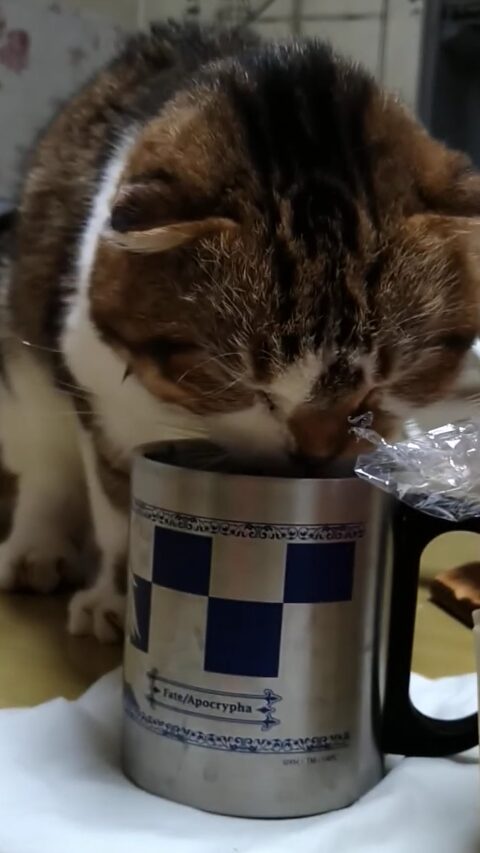 下の画像は水を自棄飲みする「カイ」ちゃん。この日はもうちゅ~るは完売(ストックはありますが6本食べちゃってました)でしたので…。ちなみにこのコップは弟から提供されて…ません。母が勝手に「カイ」様の飲み水用に使い始めました。