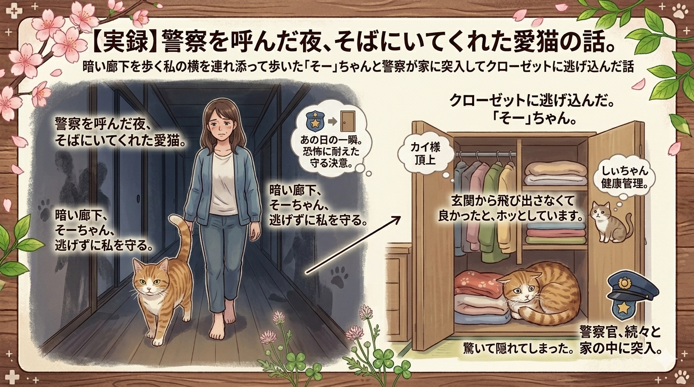 私が警察を呼んで二階建ての階段を音を立てずに降りて行ったとき、その横を愛猫の「そー」ちゃんがするりと通り抜け、警察が来るまで一緒にいてくれました。どれだけ救われたかわかりません。